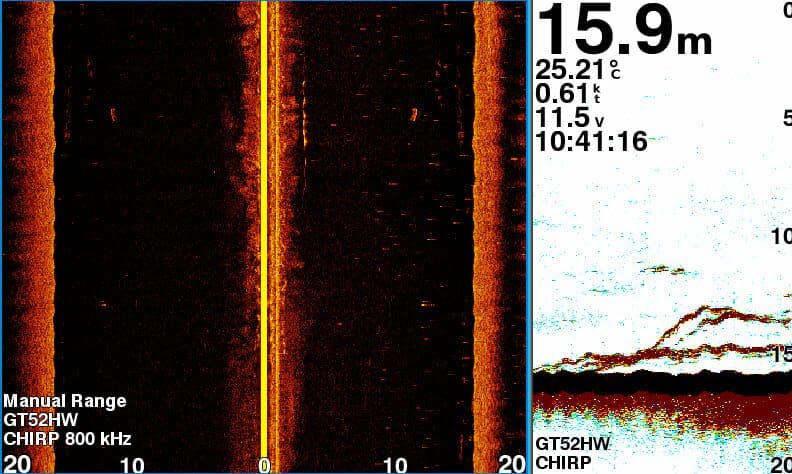 For a hint at catching them offshore at night, search for rubble pads in the middle of nowhere like the one in the following sounder shot. Our online fishing course Finding Fingermark contains a comprehensive step by step framework on how to find these areas.