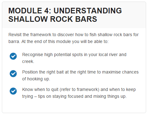 Barra Basics is a 6 module, multimedia online training that teaches you how to start generating consistent catches from your barra fishing outings.