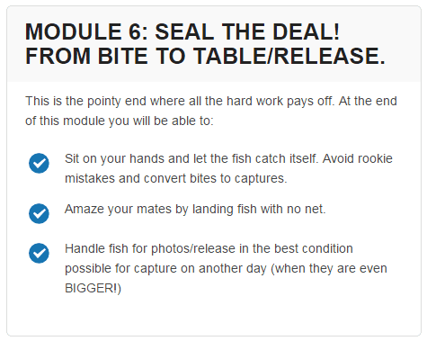 While the majority of our students will have caught some fish, I envisage a great deal of success with absolute beginners and here’s why… You will learn to think and behave like a top performer right from the start. You will avoid costly mistakes and be confident you are on the right track. We have also included a bonus on exactly what gear you need and how to use it.